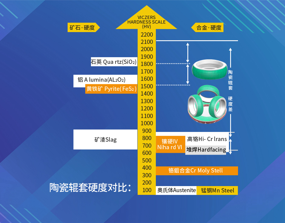 • 耐磨優(yōu)勢(shì)--陶瓷輥套/襯板(HRC57-62)
